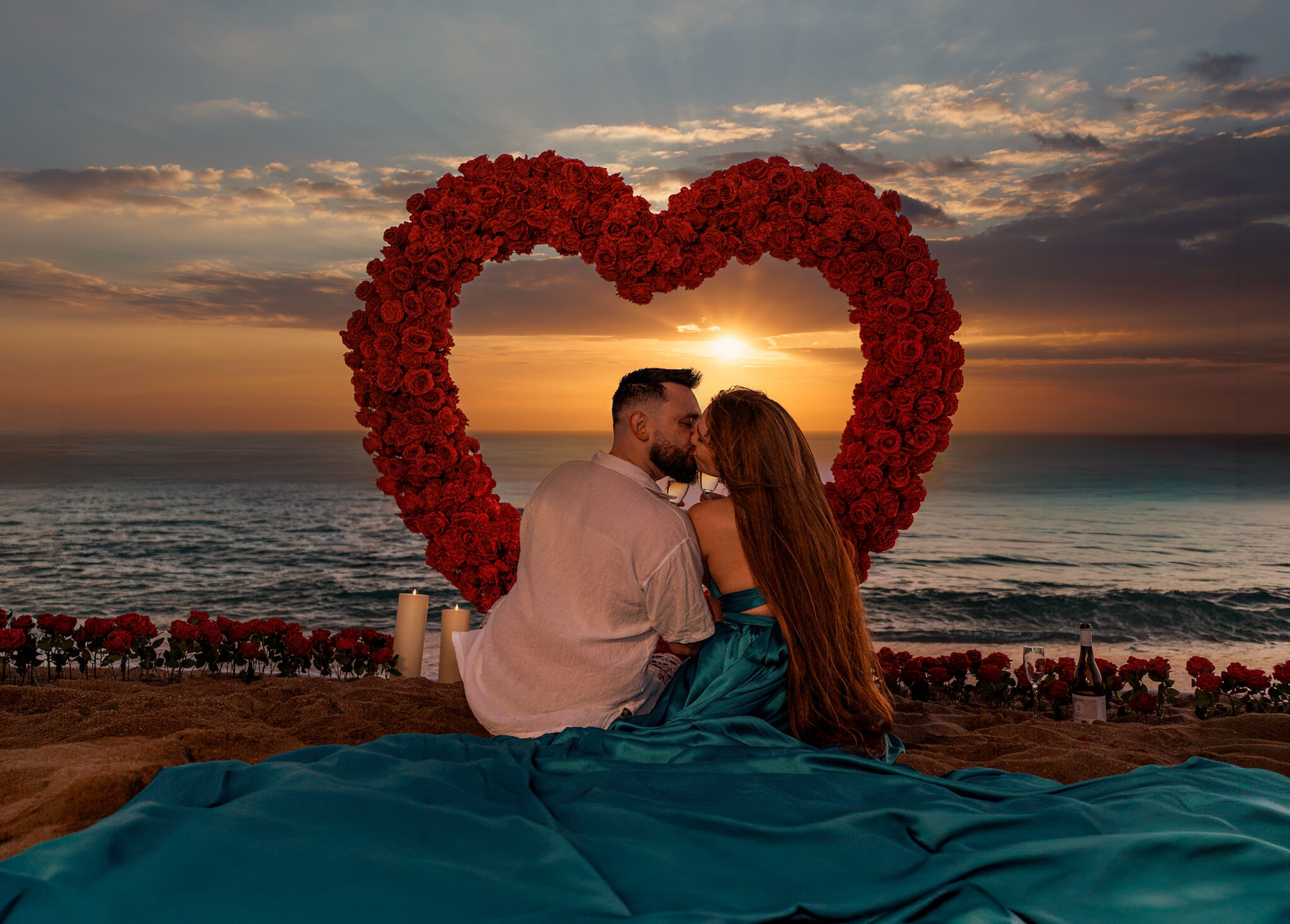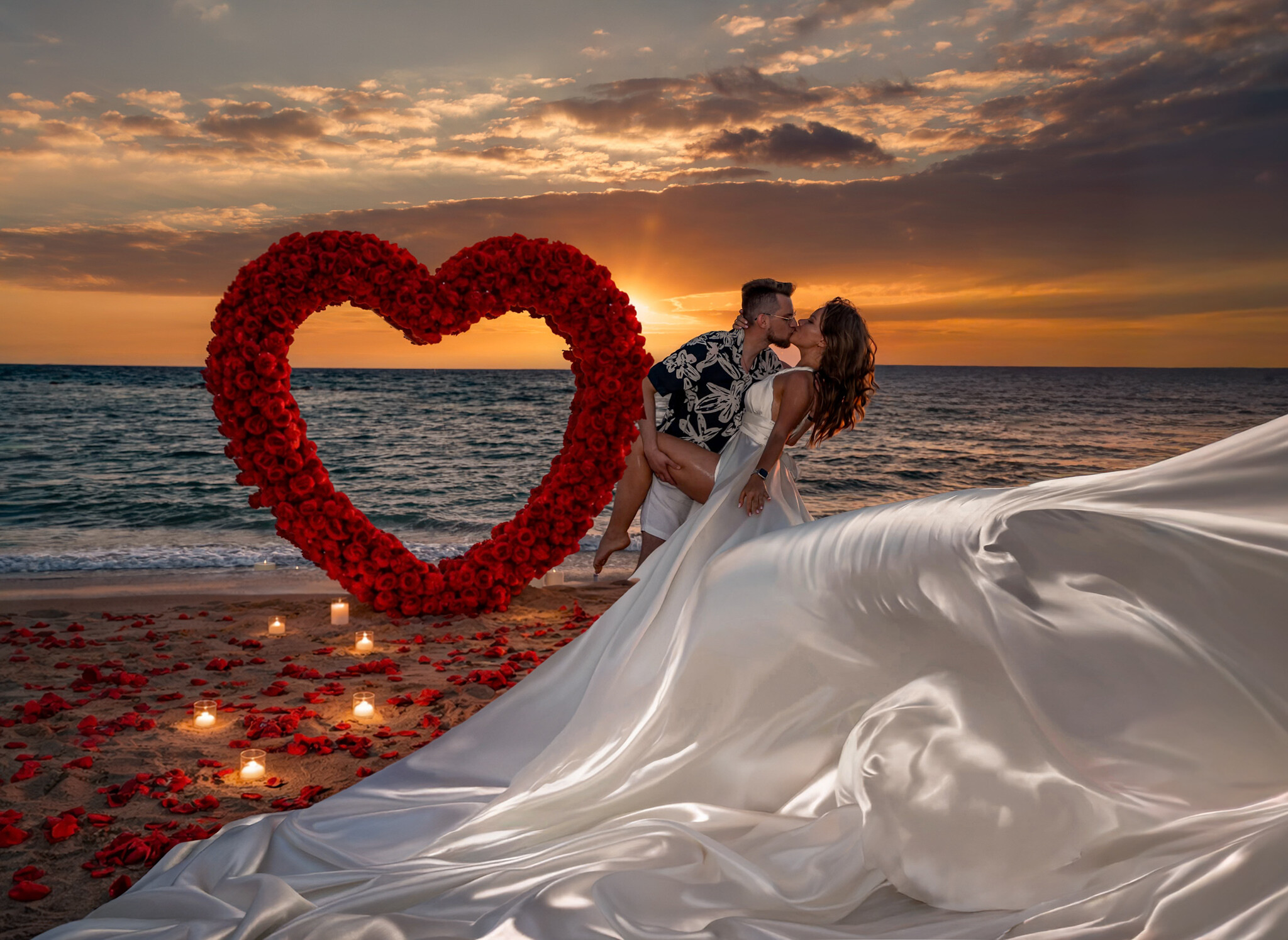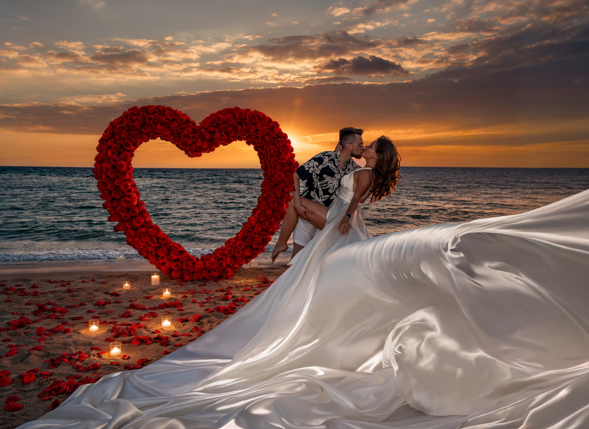 romantyczny wieczór na tle morza i zachodu słońca pod wielkim sercem z różami + Flyingdress + sesja