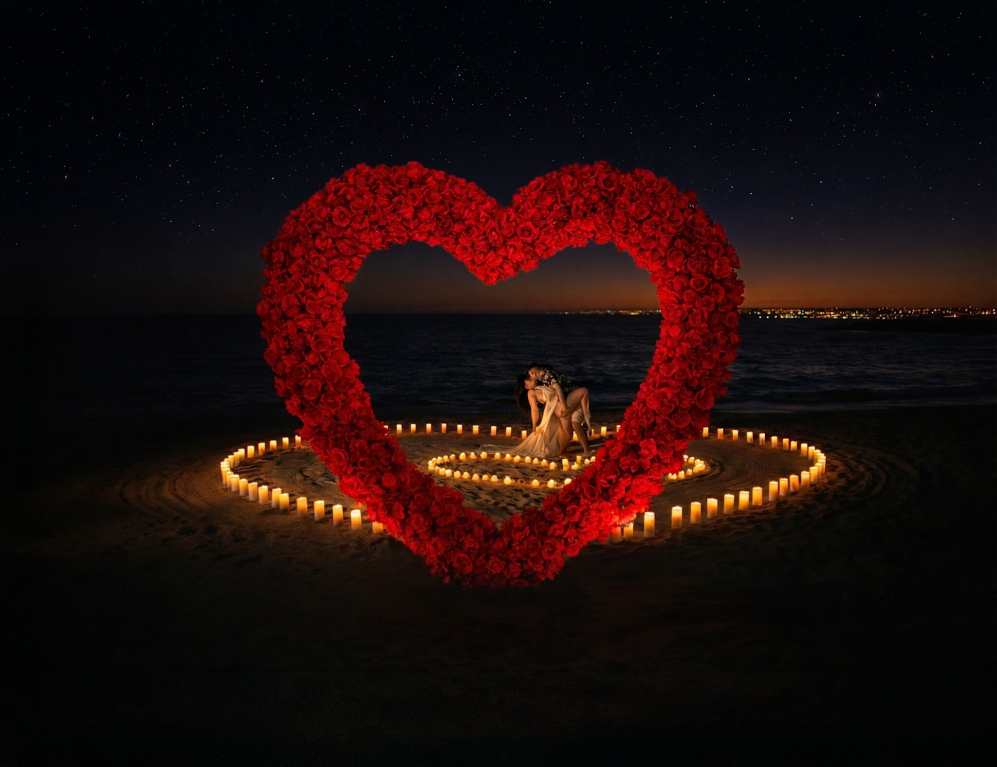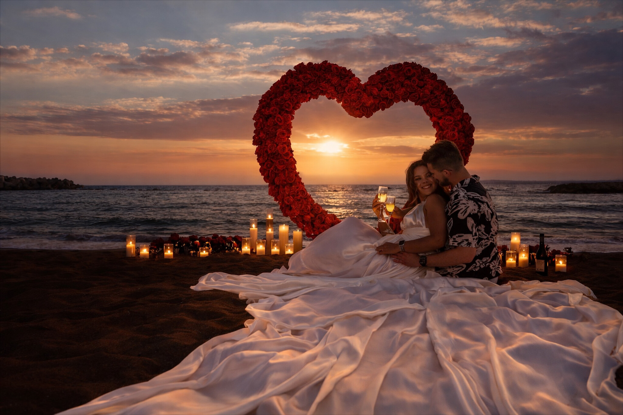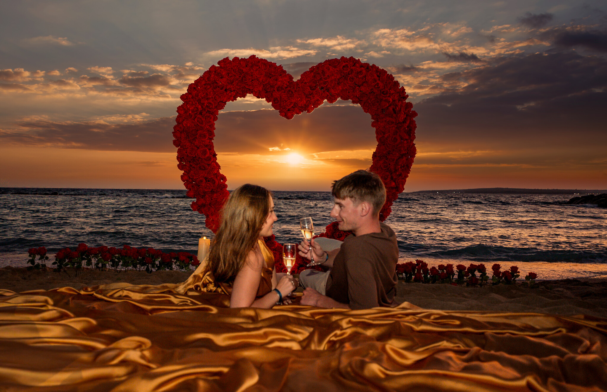 romantyczny wieczór na tle morza i zachodu słońca pod wielkim sercem z różami + Flyingdress + sesja